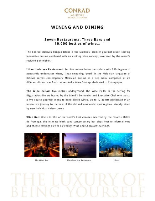 Conrad maldives rangali island sets the trend for resort dining to deliver luxe resort dining in compelling surroundings. Twice voted best hotel in the world our luxury maldives resort is the perfect escape in paradise. It marks conrad hotels resorts second venture in underwater architecture and technology the first being the ithaa undersea restaurant which launched at the same resort 13 years ago and was.