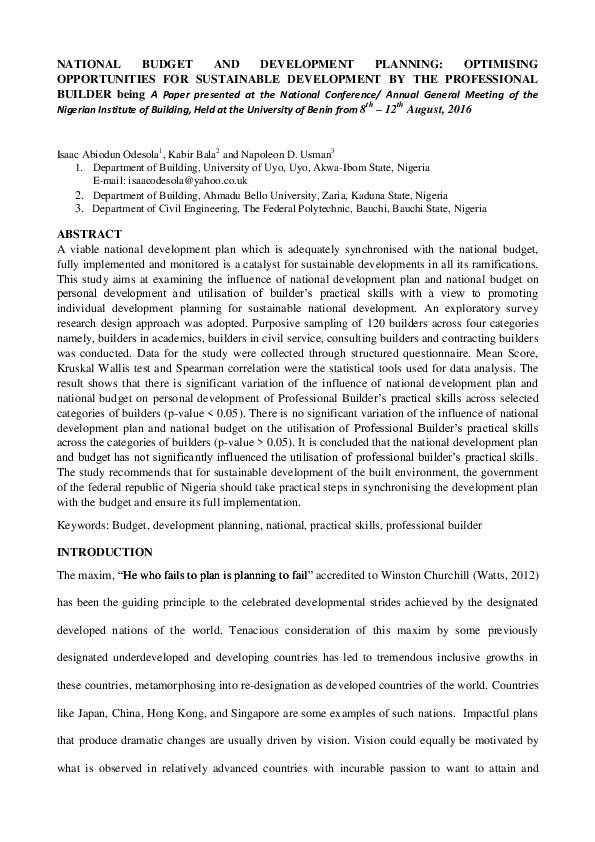 Pdf National Budget And Development Planning Optimising Opportunities For Sustainable Development By The Professional Builder Being Dr Napoleon Usman Academia Edu