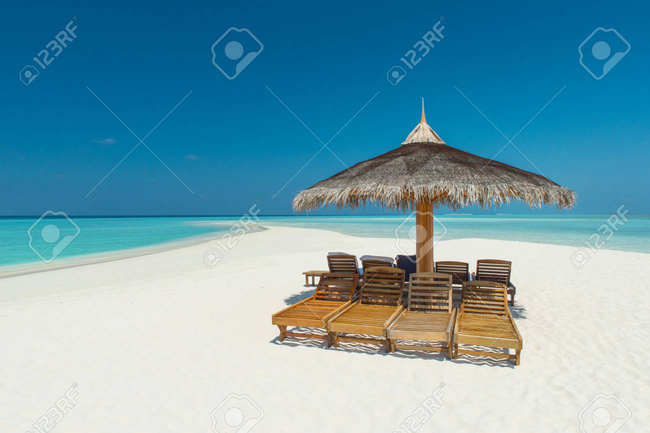 Beautiful Sandy Beach With Sunbeds And Umbrellas In Indian Ocean Maldives Island Canvas Print Myroslava