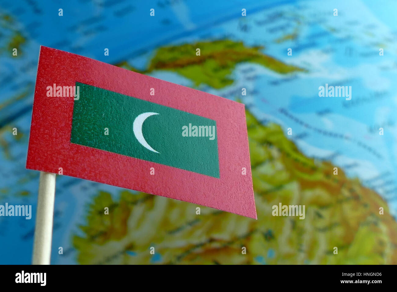 Mle on adjacent hulhule island. Near east and north africa. Globe with a world map on a wooden background with the image of the flag of maldives.