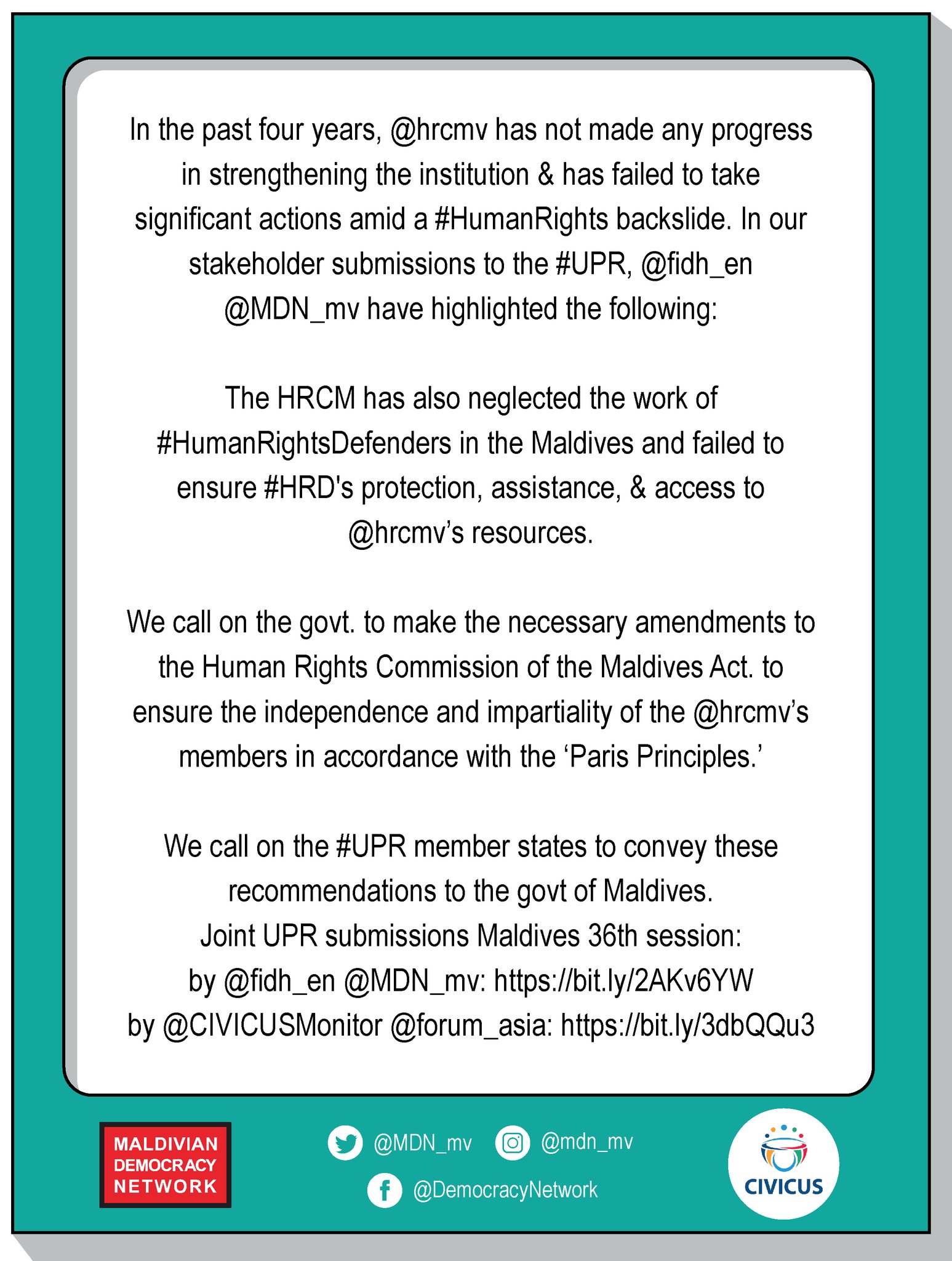 Mv Democracy Network On Twitter Joint Upr Submissions Maldives 36th Session By Fidh En And Mdn Mv Https T Co A6jd38p2dr By Civicusmonitor And Forum Asia Https T Co Ushpfgpyuj Un Hrc 9 N