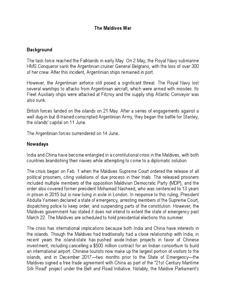 Falkland islands war also called falklands war malvinas war or south atlantic war a brief undeclared war fought between argentina and great britain in 1982 over control of the falkland islands islas malvinas and associated island dependencies. The 1988 maldives coup detat was the attempt by a group of maldivians led by businessman abdullah luthufi and assisted by armed mercenaries of a tamil secessionist organisation from sri lanka the peoples liberation organisation of tamil eelam plote to overthrow the government in the island republic of maldives. Pages in category wars involving the maldives the following 3 pages are in this category out of 3 total.