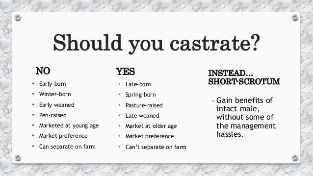 Maybe if i had been castrated back then i would not had to go through the removal of my prostrate radiation treatments and the side effects and even now wish i had been castrated as part of my treatment. When considering how age at castration affects animal welfare the consensus is that the younger the calf is at time of castration the less impact castration has on its welfare and performance carter 2011 another huge benefit of castration is the impact it would have on obesity levels. It is well known that this procedure is painful and causes a period of slowed growth rate and poorer feed efficiency especially if the procedure is delayed until the calves get older and heavier.