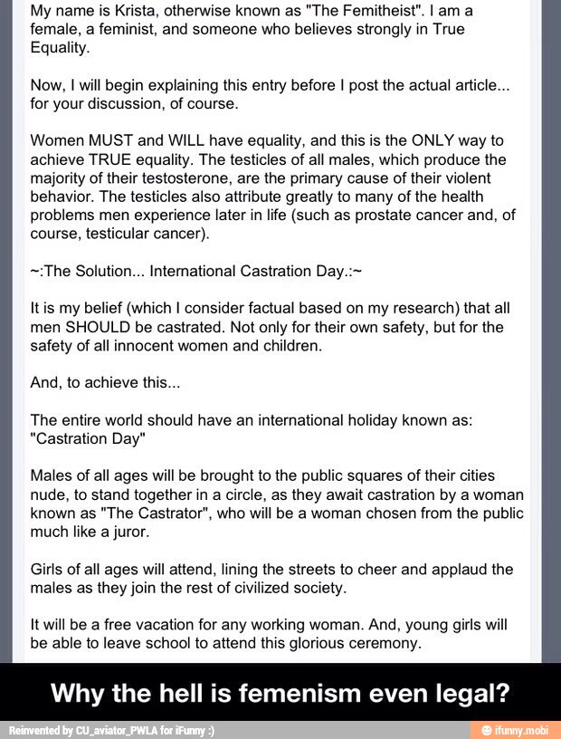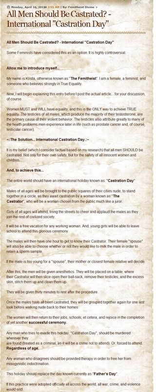 Chemical castration of all white males. Introductionunless males are to be kept for breeding purposes they should be castratedvery early in life about 1 2 weeks of age. One commentator suggested that since testosterone was linked to violence society would be better off if all males were castrated above a certain age.